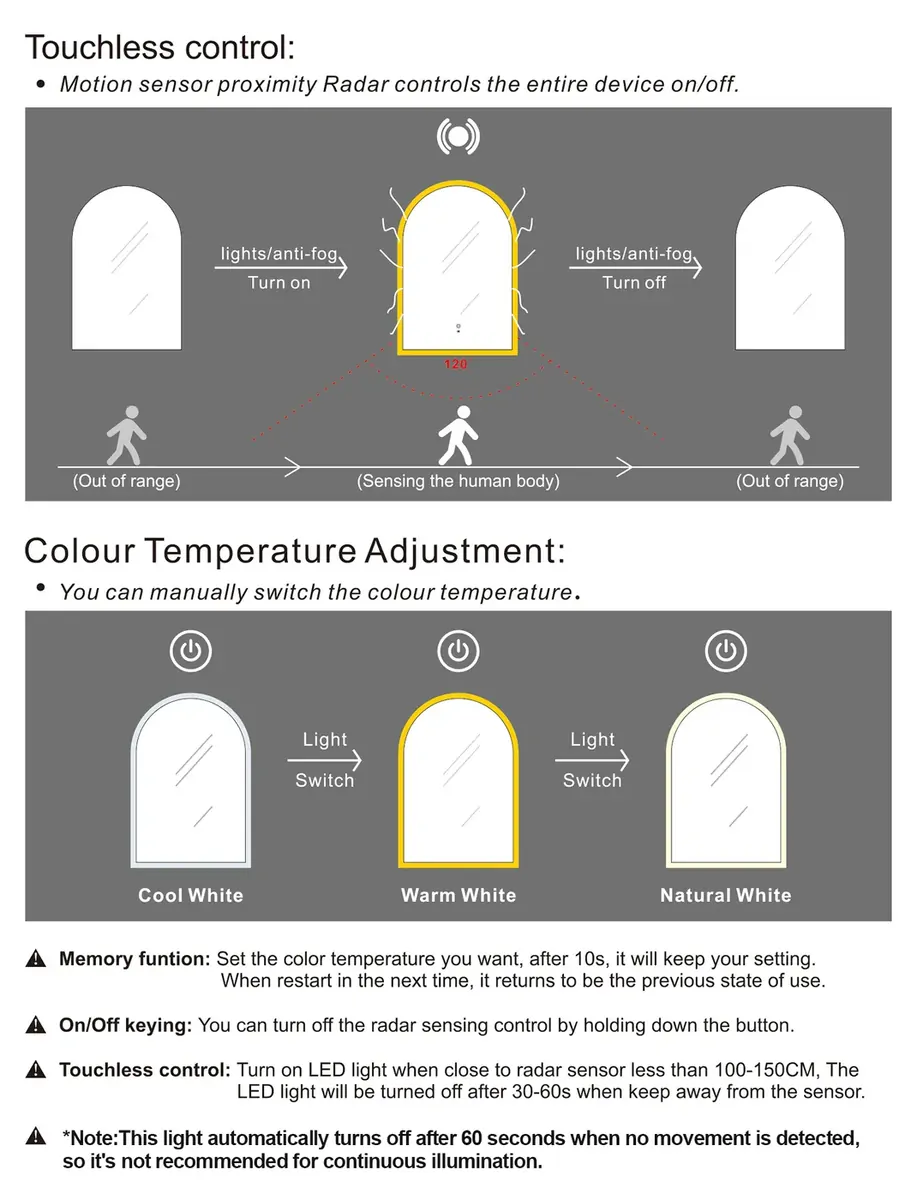 - The mirror lights up with the sensor turning on automatically