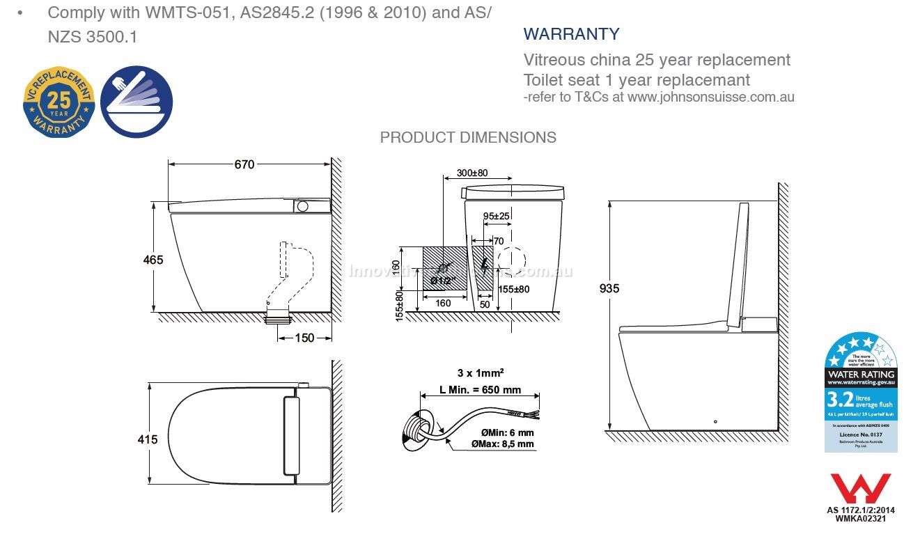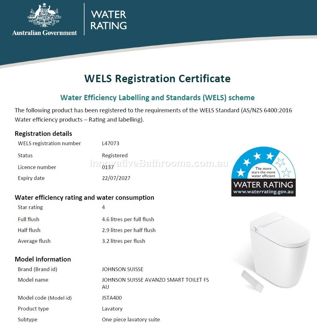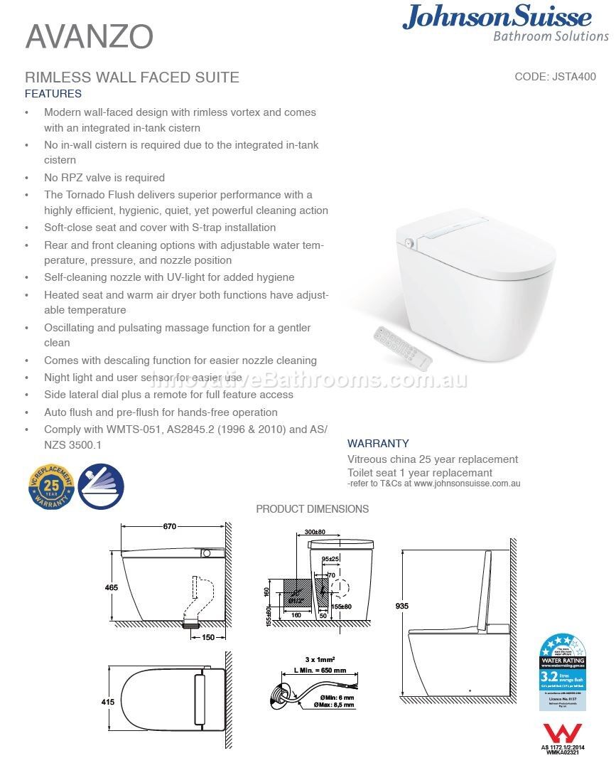 - Johnson Suisse Avanzo Smart Toilets have an Integral High Hazard Backflow Prevention device